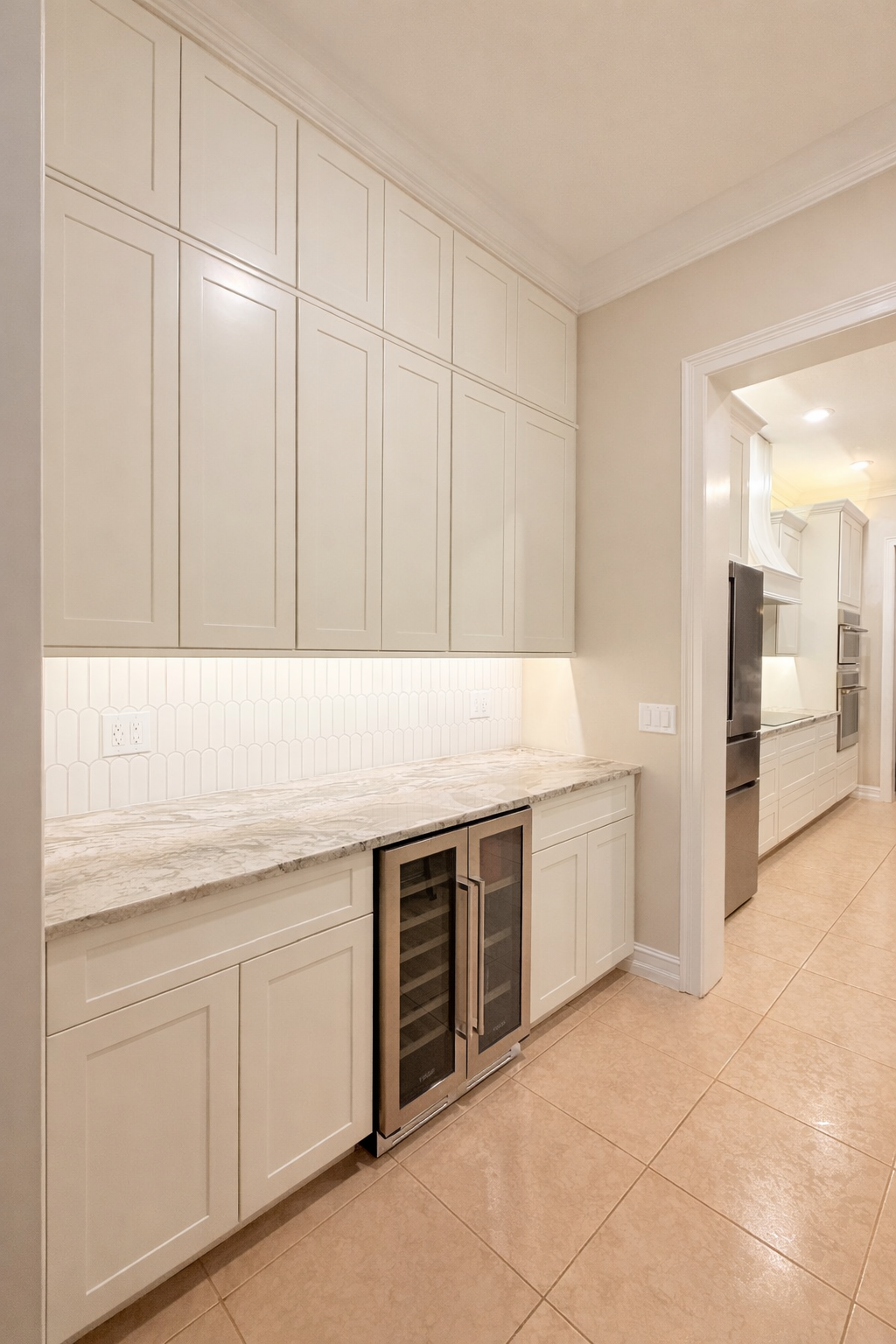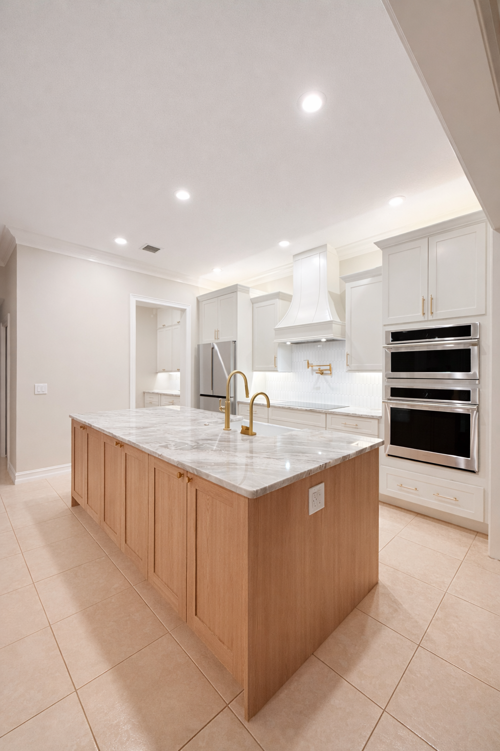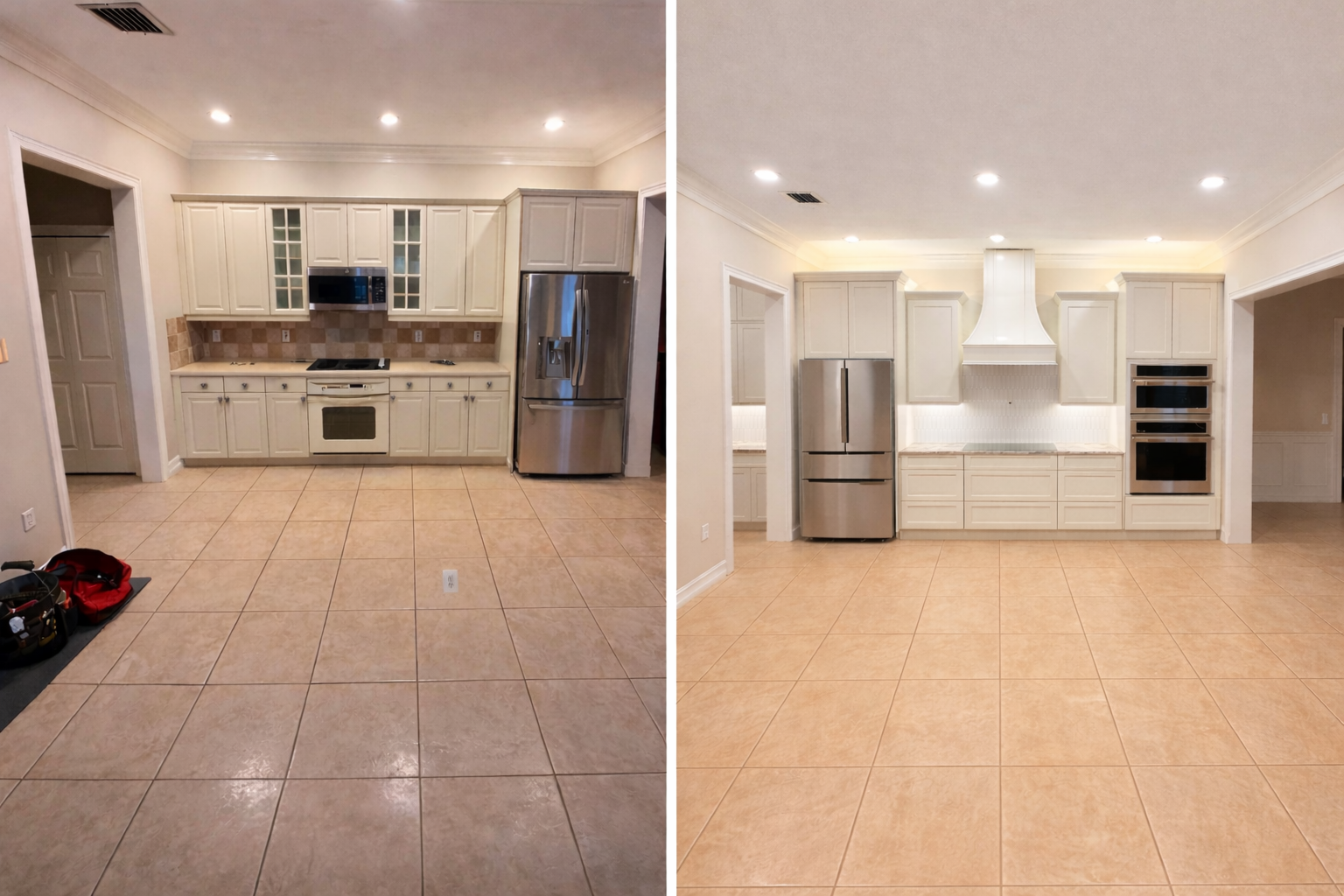 The refrigerator was relocated closer to the new pantry area to enhance storage efficiency and simplify the organization and distribution of groceries. Additionally, a stackable oven was positioned nearer to the family dining room, allowing for easier transfer of dishes from the oven to the table—especially during holidays and special occasions.