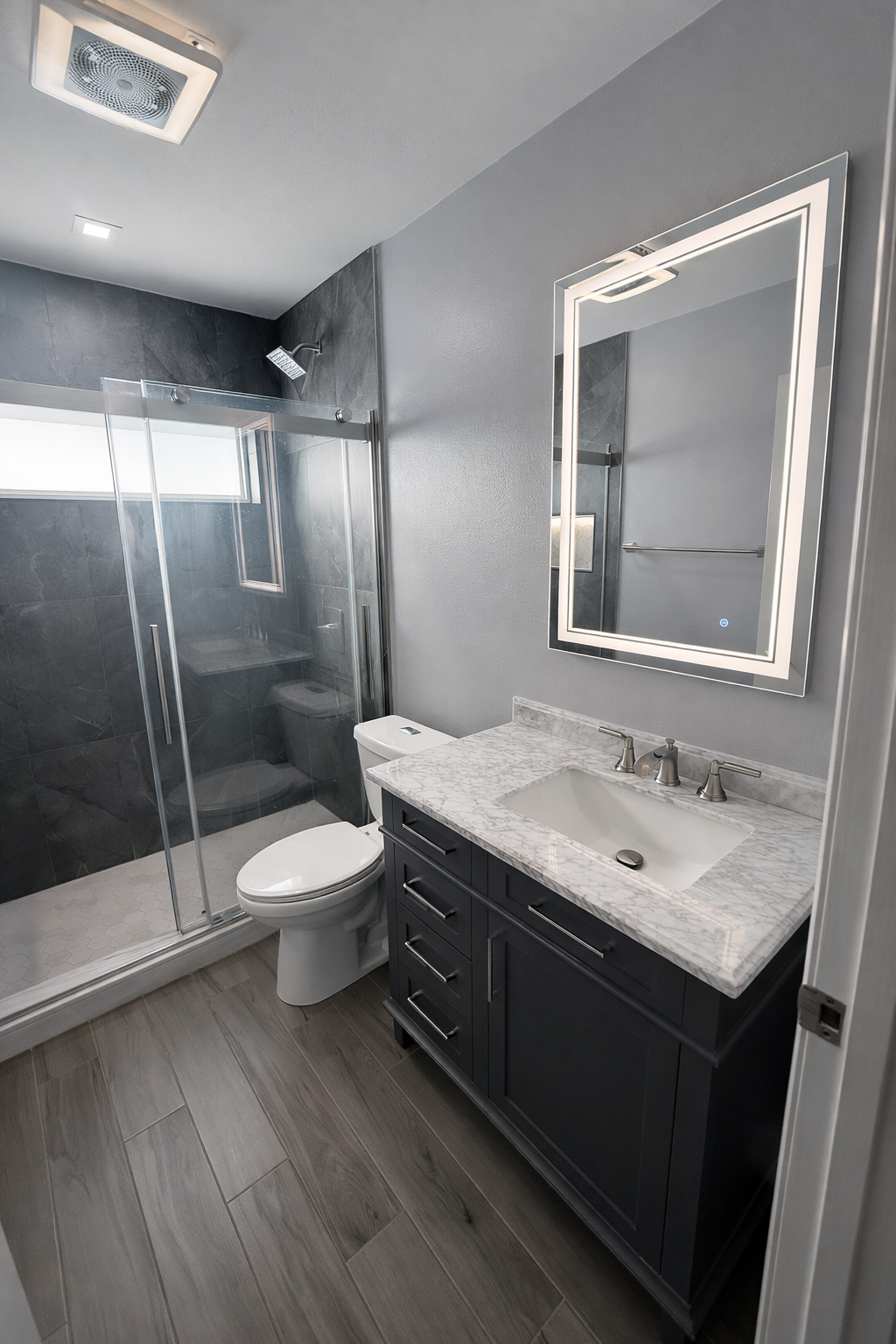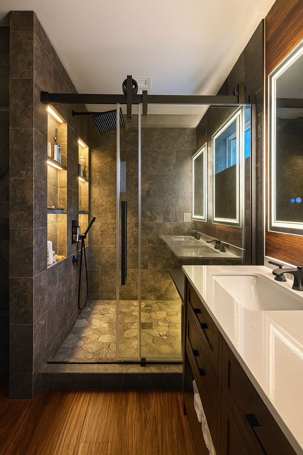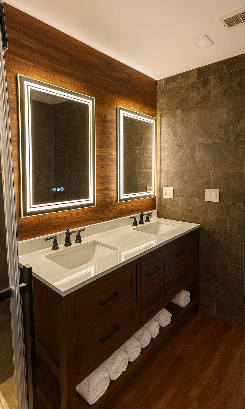 Every project begins with listening. This bathroom renovation emerged from a collaborative process that translated the client’s desire for a Colorado-inspired hospitality retreat into a space that feels intentional, personal, and enduring. Light—both natural and artificial—shapes the experience, paired with a restrained palette of stone and wood textures selected for warmth, continuity, and longevity. Luxury wood-look flooring was specified for performance without compromise, while integrated waterproofing and underlayments ensure long-term durability. The result is a refined, immersive bathroom designed for daily enjoyment and lasting performance.