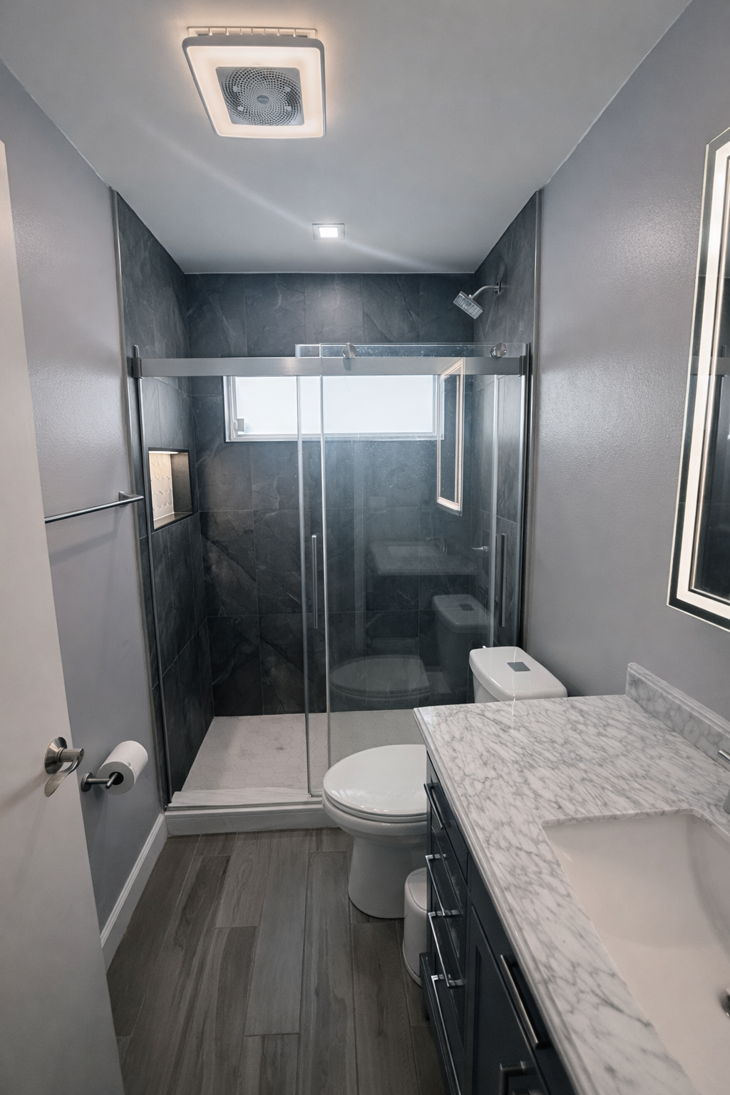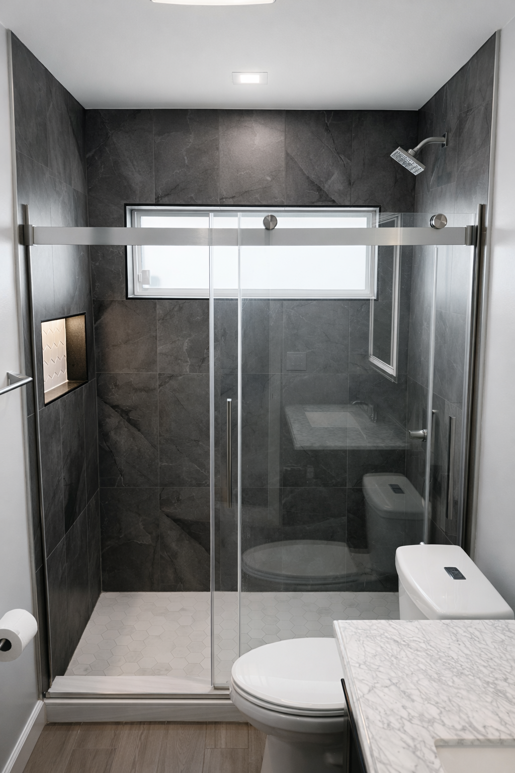 This bathroom renovation was designed to deliver a modern, elegant retreat defined by balance, restraint, and material sophistication. A soft, low-contrast palette was selected to create an airy and calming atmosphere, allowing layered textures to take center stage—from the warm flooring and marble countertop to the refined wall tile and custom shower curb.